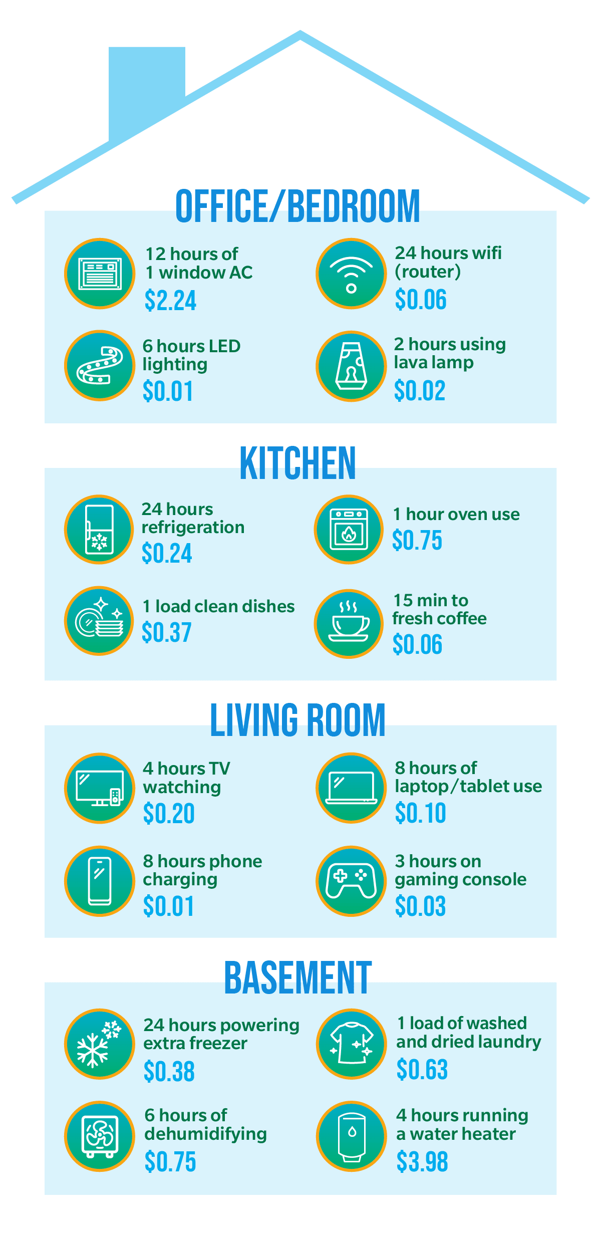 Many household appliances such as refrigerators, air conditioners, and phone chargers cost less than $1 a day to run for the average Eversource customer.