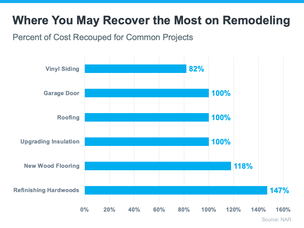 In addition to making sure your house makes a good first impression, you’ll also want to consider the return on your investment (ROI) for any renovations. According to the 2022 Remodeling Impact Report from the National Association of Realtors (NAR), here are the projects that could net you the best return when you sell your house (see visual below):
