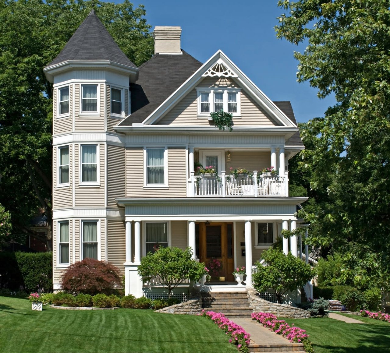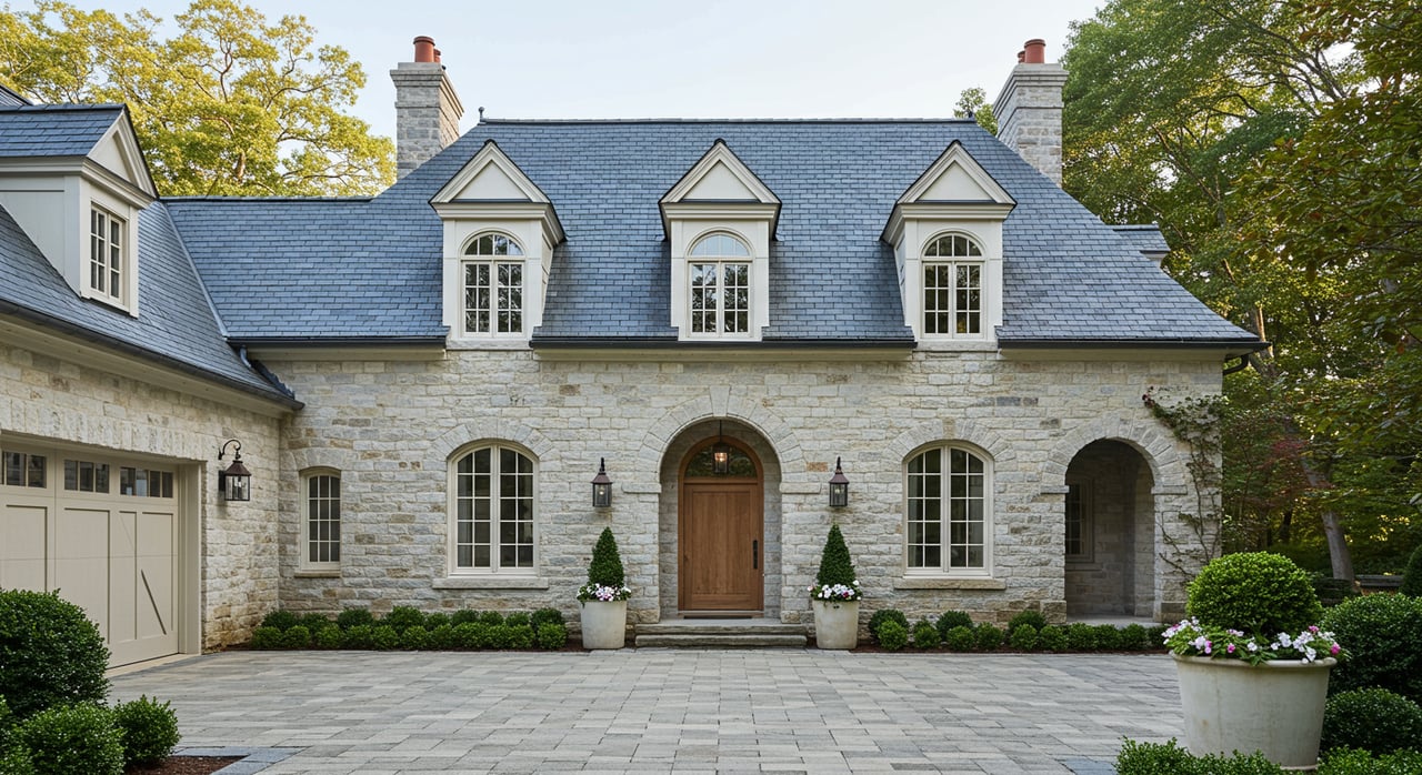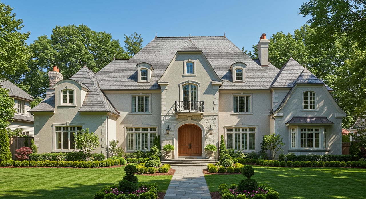 A grand, sprawling white mansion with a prominent dark grey, multi-gabled roof and several tall chimneys.