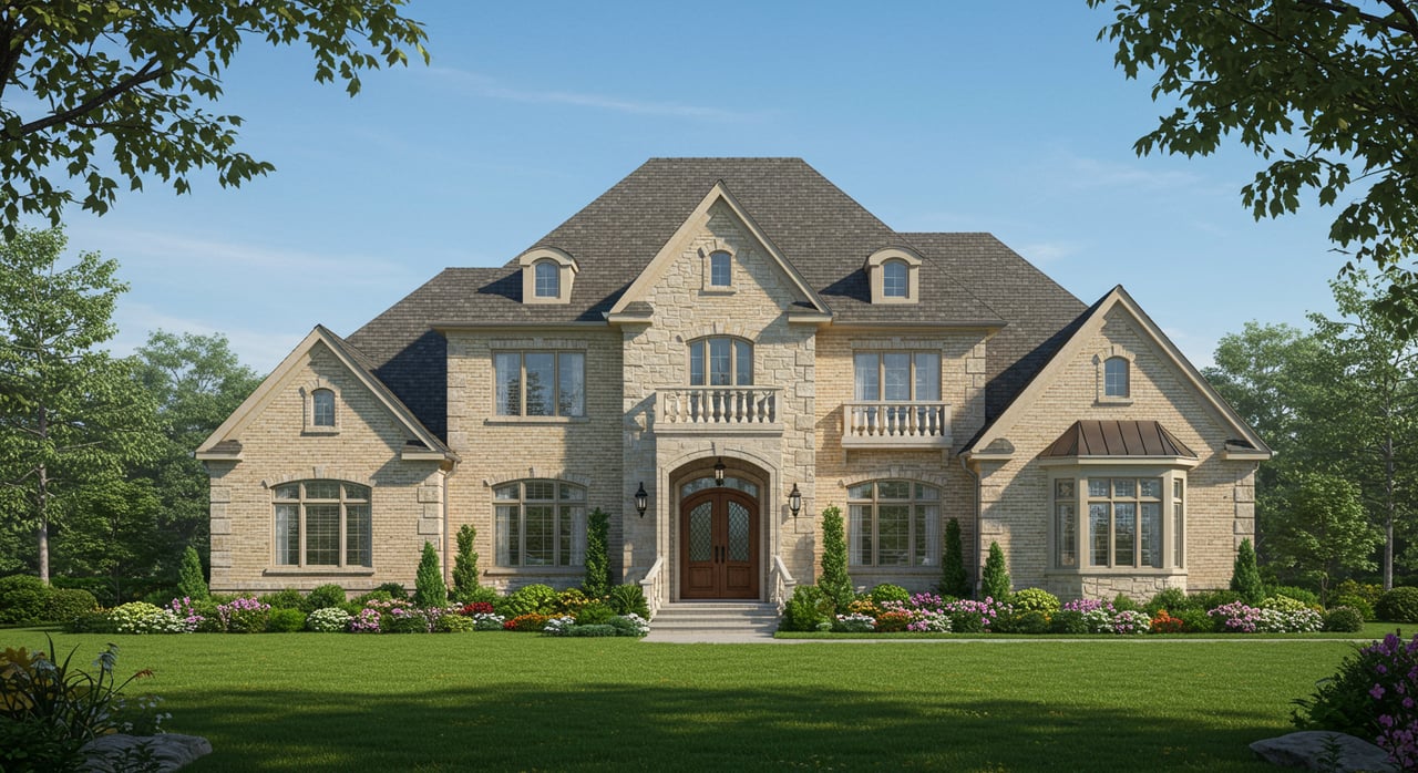 The house features a warm, earthy color palette with walls of stucco and stone veneer, particularly prominent on the arched entryways and columns.