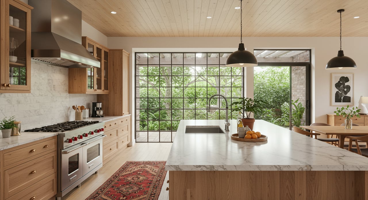 A modern kitchen with a large island, wood herringbone floors, and light wood cabinets, featuring an oversized window.