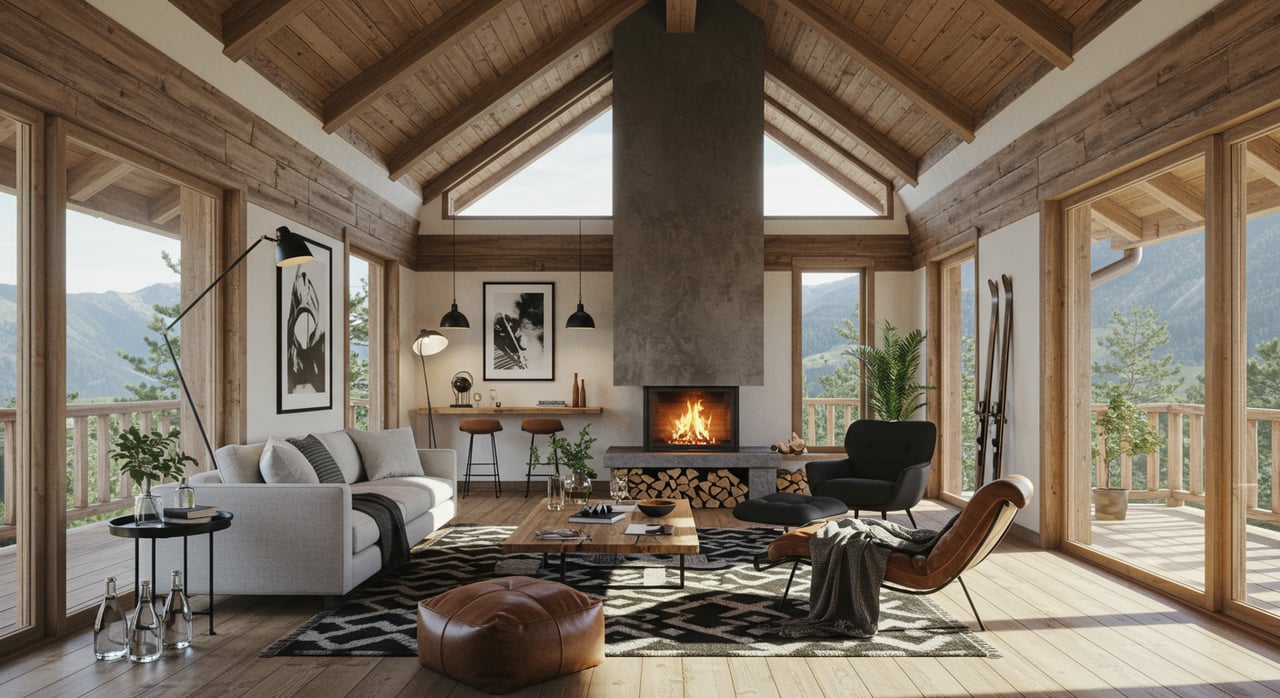 A spacious living room with vaulted ceilings, exposed wood beams, two white sofas, a fireplace, and large windows.