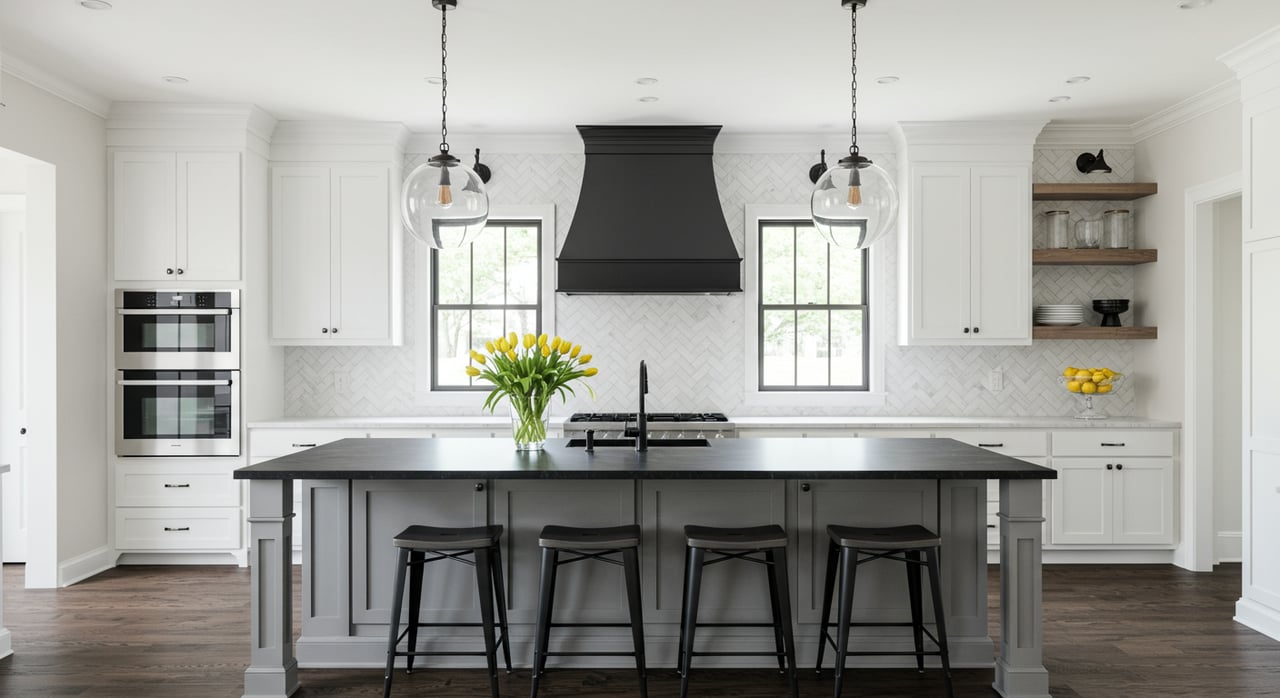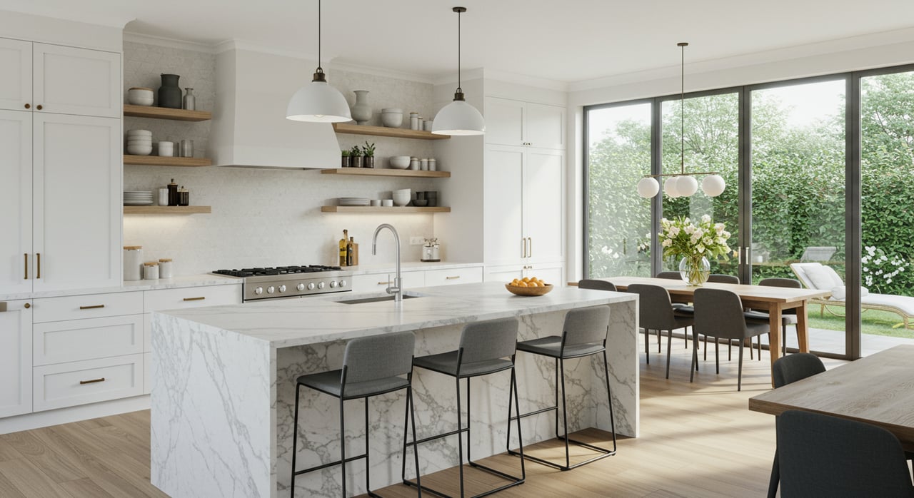 A spacious, bright kitchen with white cabinets, a large island with a marble countertop, and a brass light fixture.